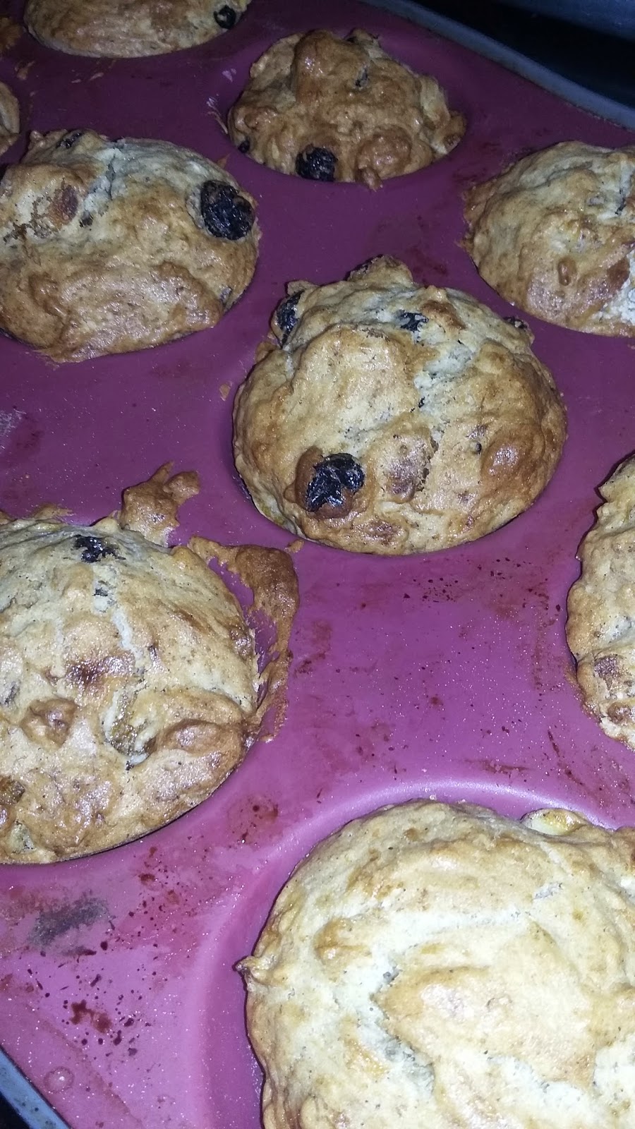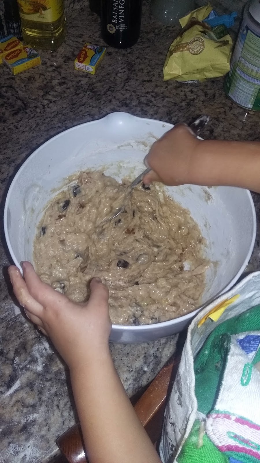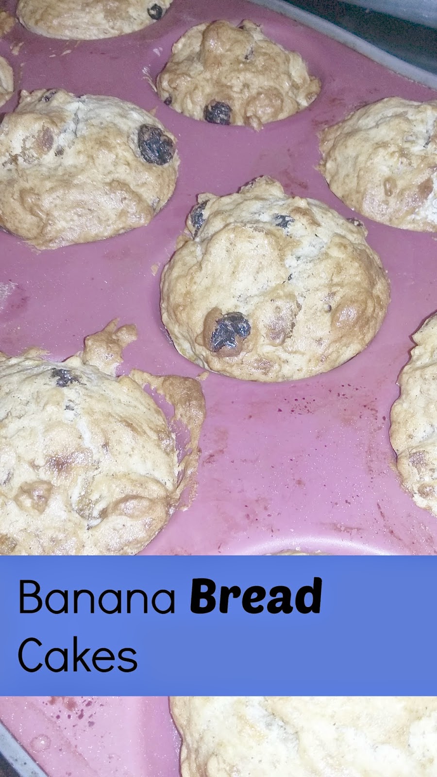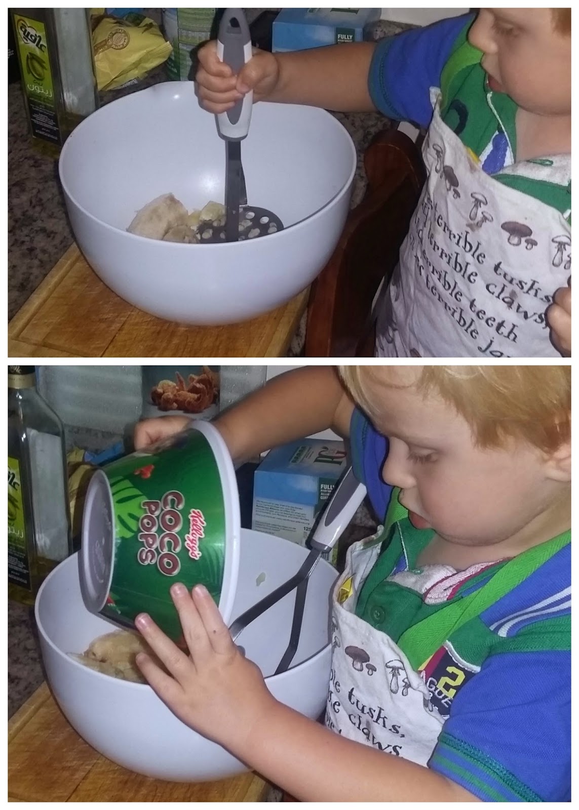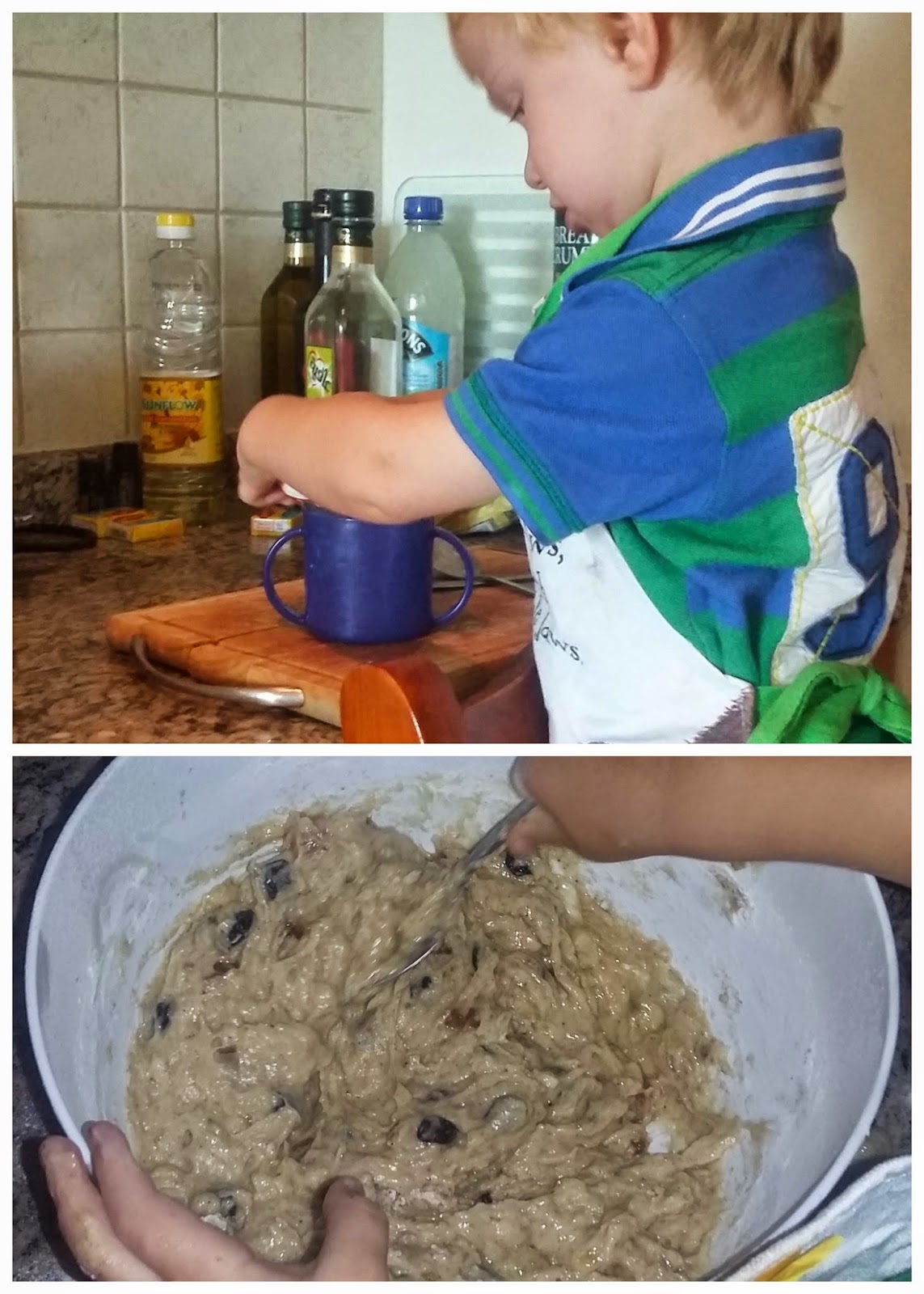 I actually did this with the toddler before we moved home, and half of my kitchen was at the new house, including my loaf tin.  So we made banana bread cakes instead.  The original recipe actually has double the sugar and no fruit, but we do attempt to make a toddler friendly version so I have cut a lot of the white sugar out and replaced with dried fruit.  I also think that you could cut it out altogether and the “bread” would still be sweet enough.